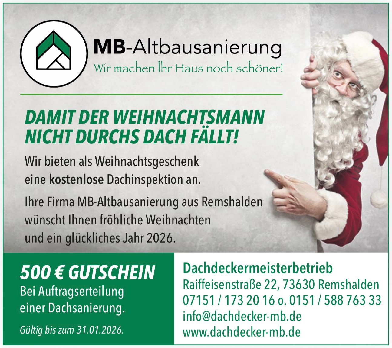 Gepostet auf Wolfgang GerlachTrustindex überprüft, ob die Originalquelle der Bewertung Google ist. Mit den Leistungen von MB - Altbausanierung war ich sehr zufrieden. Rocky und sein Team haben phantastische Arbeit geleistet. Engagiert, kompetent, fleißig und dabei immer gut gelaunt und freundlich. Das neue Dach ist ein echter Hingucker. Vor allem die Blechverwahrungen sind toll. Herzlichen Dank für die gute Betreuung.Gepostet auf Günter SeiboldTrustindex überprüft, ob die Originalquelle der Bewertung Google ist. Super gearbeitet, kompetent und freundlich. Kann diese Firma nur weiter empfehlen.Gepostet auf Dagmar Kraus-StubenrauchTrustindex überprüft, ob die Originalquelle der Bewertung Google ist. Von Anfang bis Ende hat die Zusammenarbeit super geklappt und viel Freude gemacht. Kompetente Beratung und sehr freundliche Bauleitung, klare Angebotserstellung, hervorragende Ausführung, sehr freundliches motiviertes Team, sehr gute Kommunikation, Baustelle immer tip top, Termine wurden exakt eingehalten. So macht Bauen Spaß! Vielen Dank an das ganze Team!!!Gepostet auf Horst KleinmannTrustindex überprüft, ob die Originalquelle der Bewertung Google ist. Die Firma MB-Altbausanierungen ist sehr empfehlenswert. Von der Beratung, über die fachgerechte Ausführung, bis hin zur präzisen Einhaltung des Terminplans war alles korrekt und zuverlässig und der Kostenvoranschlag wurde genau eingehalten. MB-Altbausanierung verdient eine sehr gute Bewertung.Gepostet auf Helmut OberbörschTrustindex überprüft, ob die Originalquelle der Bewertung Google ist. Selten habe ich einen Handwerksbetrieb erlebt, bei dem wirklich alles so rund lief, wie hier. Sehr gute Kommunikation, tolle Reaktionszeiten und handwerklich gute Arbeitsqualität. Die Zeitdauer zwischen Kontaktaufnahme und Erledigung der Dachdecker-Arbeiten war nur 10 Tage. Sehr empfehlenswert.Gepostet auf Moritz WaldnerTrustindex überprüft, ob die Originalquelle der Bewertung Google ist. Der Dachdecker war äußerst pünktlich und hat sehr sorgfältig gearbeitet. Das Angebot wurde schnell erstellt und die Ausführung war top. Sehr zufrieden mit der Arbeit!Gepostet auf Thomas PalmerTrustindex überprüft, ob die Originalquelle der Bewertung Google ist. Wir sind sehr zufrieden mit den durchgeführten Arbeiten sowie den schnellen Termin zur Durchführung. Die Arbeiter waren sehr freundlich mit einem höflichen Umgangsform. Wir habe MB Dachdecker bereits weiterempfohlen.Gepostet auf Mr. BbTrustindex überprüft, ob die Originalquelle der Bewertung Google ist. Wir sind mit den durchgeführten Arbeiten sehr zufrieden. Vom Beratungstermin bis zur Fertigstellung vergingen weniger als 3 Wochen, die eigentlichen Arbeiten wurden in 1 Woche erledigt. Das MB Dachdecker Team hat zuverlässig und gewissenhaft gearbeitet, was sehr angenehm im Umgang und hat am Ende alles sauber und aufgeräumt gelassen. Was besonders hervorzuheben ist, war die Flexibilität, unseren terminlichen Wünschen zu entsprechen, so dass wir im Anschluss auch noch PV-Module von einem anderen Anbieter aufs Dach montieren konnten. Wäre das nicht möglich gewesen, hätten wir zwei Baustellen mit zweimal Gerüstaufbau in kurzem Abstand hintereinander. Vielen Dank!Gepostet auf Johann MoschalowTrustindex überprüft, ob die Originalquelle der Bewertung Google ist. Wir haben mit Dachdecker MB durchweg positive Erfahrungen gemacht. Die Beratung war kompetent und verständlich, alle unsere Fragen wurden ausführlich beantwortet. Die Arbeiten wurden termingerecht und mit hoher handwerklicher Qualität ausgeführt. Besonders beeindruckt hat uns die saubere und präzise Arbeitsweise des Teams. Klare Empfehlung für alle, die eine zuverlässige Dachdeckerei suchen!Gepostet auf Andy EnzeTrustindex überprüft, ob die Originalquelle der Bewertung Google ist. Alles gut gelaufen... Das Angebot war fair und die Terminvergabe war sehr schnell. Da ich noch gleichzeitig eine Solaranlage installiert habe hat er mir Kulanzweise das Gerüst eine Woche länger stehen lassen das sparte mir bares Geld. Absprachen wurden unkompliziert via. Whatsapp auch außerhalb der „normalen“ Zeiten besprochen. Kann die Firma nur weiterempfehlen...